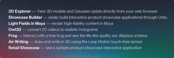 Did I mention we've been busy? Last week, we unveiled some new tools we’re calling Experiments. What is it? A catalog of tools and applications created to help you explore the endless possibilities of Looking Glass Displays.