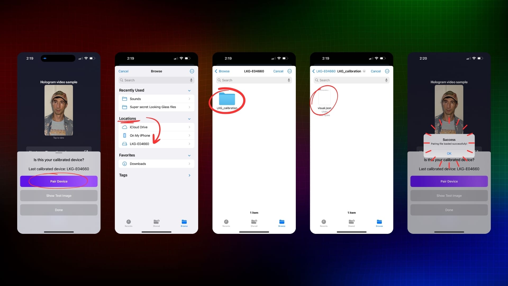 - If the app doesn't automatically navigate to the file, calibration files are under Locations → LKG-XXXXXX (your device serial number) → LKG_calibration folder → visual.json. Select the visual.json file.