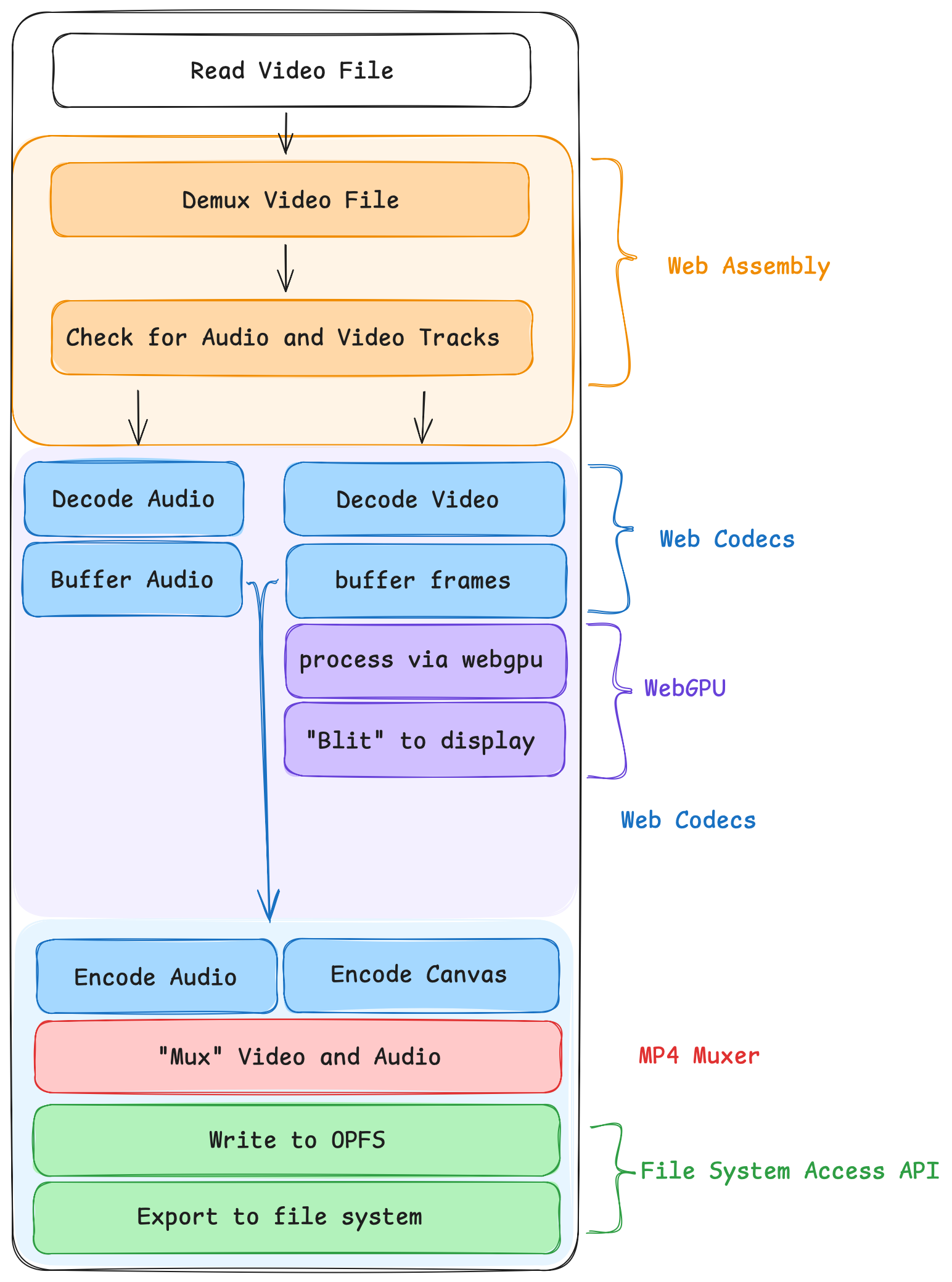 While the WebCodecs API allows us to decode a video directly, there’s still no browser API for reading video files or writing them. To do that, we need to use other libraries and, for the Portrait and Go, write a new video for playback in Standalone mode.