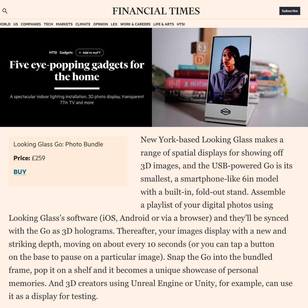 We’re honored to have Looking Glass Go recently featured in the Financial Times as a standout in their roundup of “Eye-Popping Gadgets for the Home.”