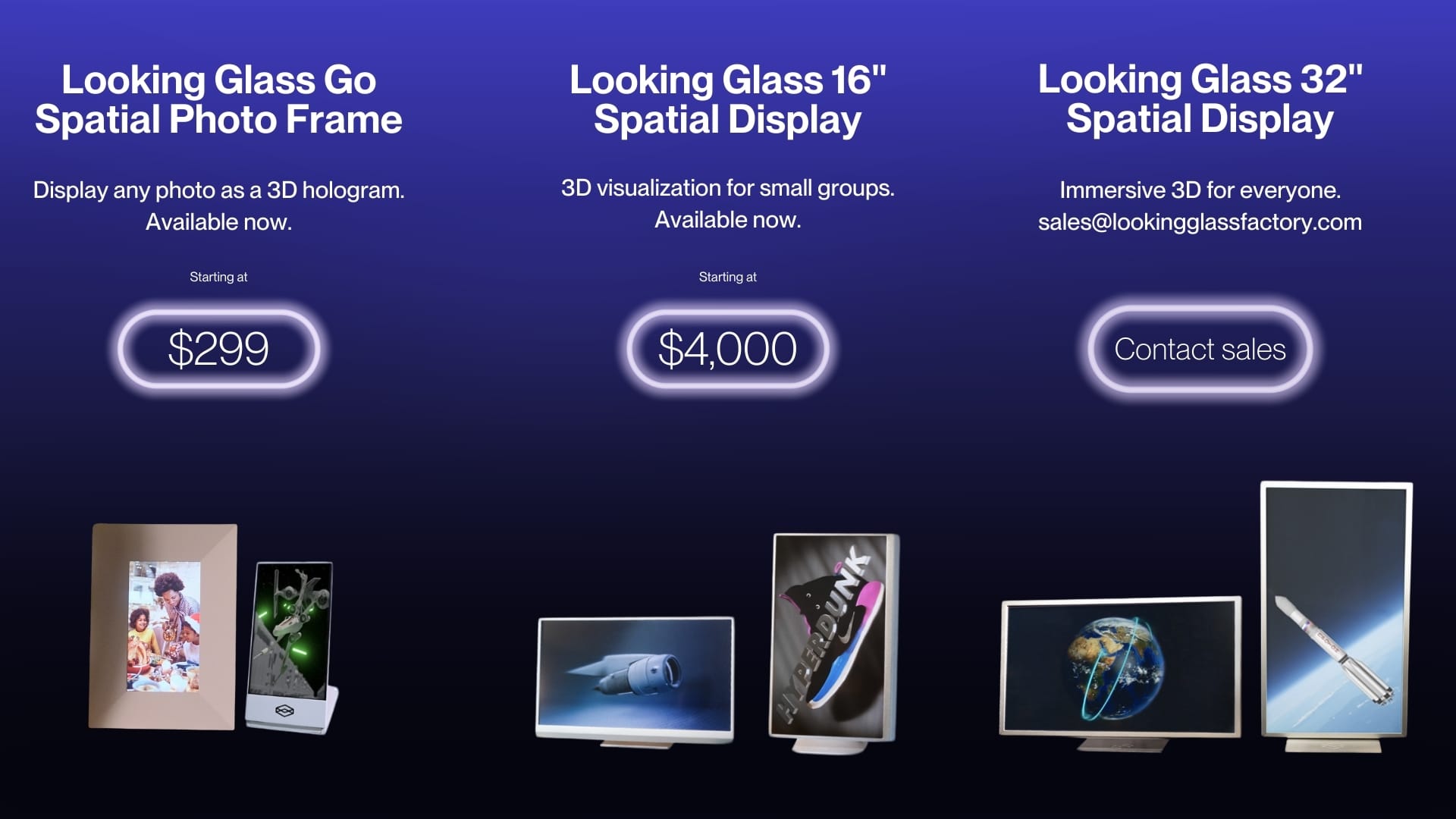 Looking Glass displays come in a range of sizes, from the compact Looking Glass Go for individual creators and showing spatial photos to larger models like the 16'', 32'', and 65''. The varied sizes of Looking Glass displays enable a wide range of use cases, which extend from presentations and digital replicas to experiential marketing, retail, and other professional and entertainment settings. All models work on the same core principle: showing 3D media from multiple angles without requiring any special eyewear.