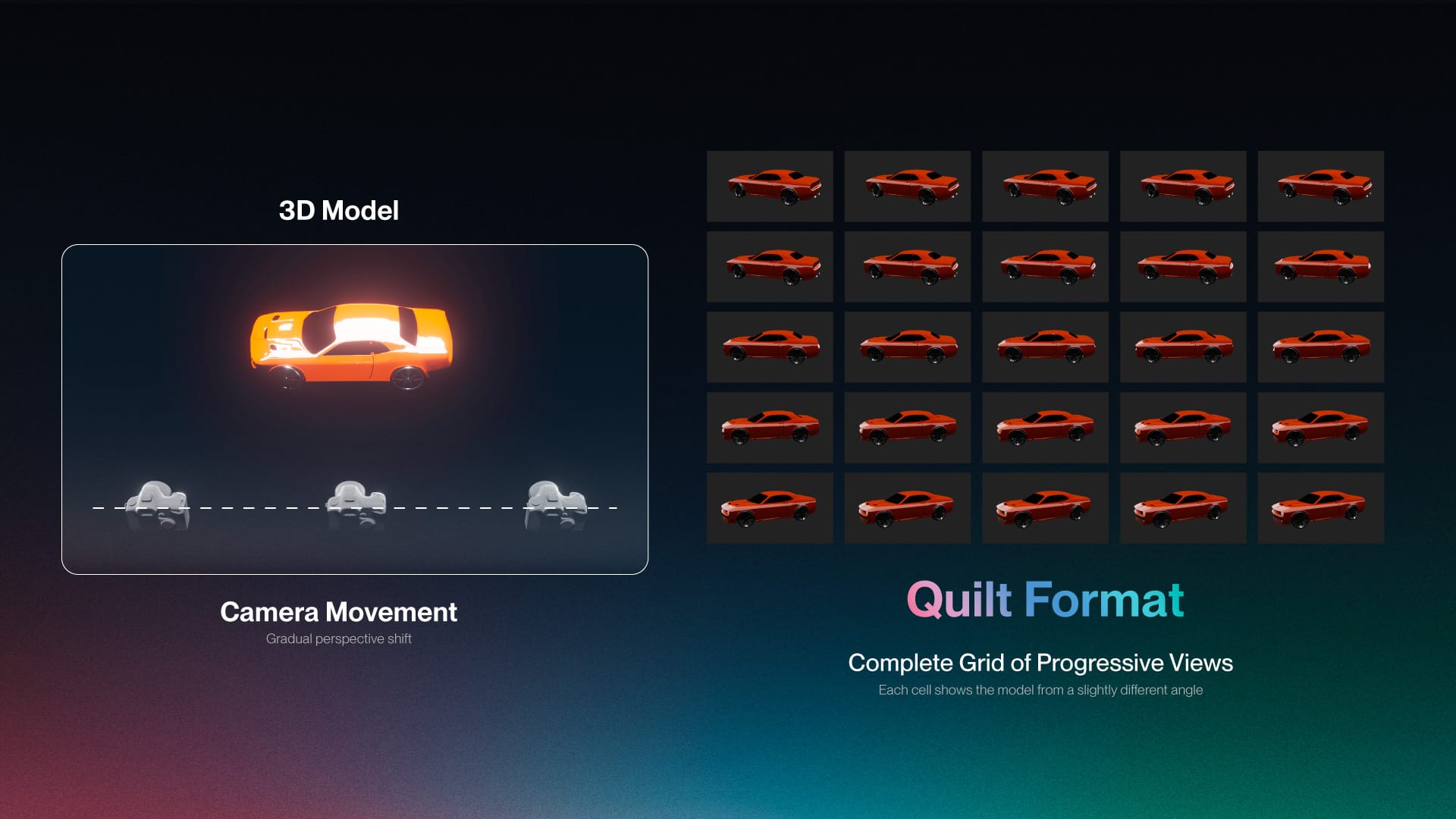 At the core of this system are 'Quilts', which organize 3D content into standard file formats like JPEG, PNG, and MP4 for display on Looking Glass displays. A Quilt is a tiled image that contains multiple views of the same 3D media (images, videos, or interactive applications), with each tile representing a different perspective. Our software processes these tiled quilt images in a way that allows viewers to see various angles as they move around the display. This approach replicates how we naturally perceive depth, creating a lifelike and immersive experience for multiple viewers at once.