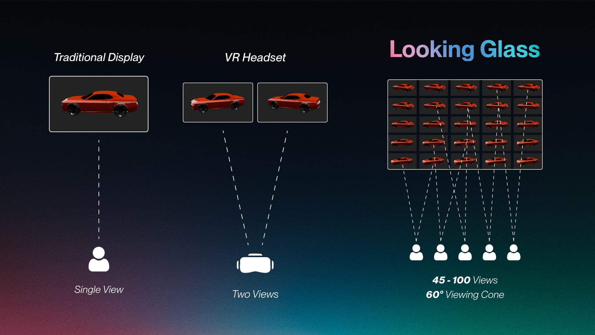 A key feature of Looking Glass displays is our proprietary and patented multiviewer hardware and software technology stack, which sets it apart from standard screens, single-viewer 3D systems, and VR/AR headsets.